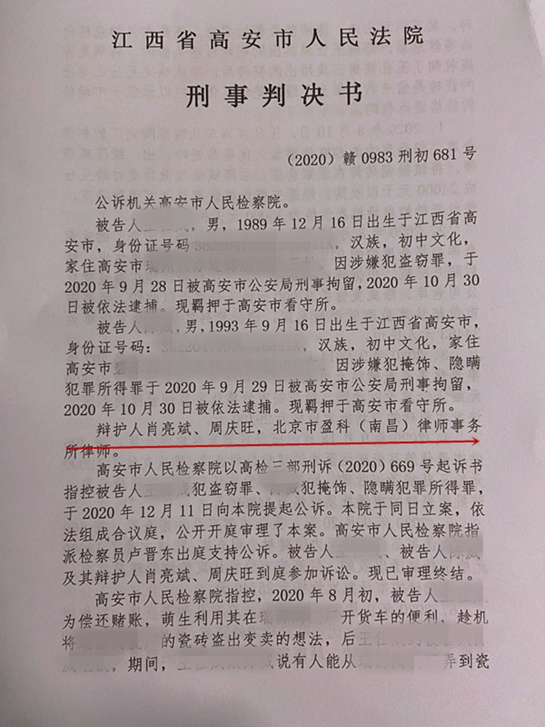 2020年8月初,嫌疑人王某某从高安某陶瓷厂盗窃瓷砖,找到其表弟陈某销赃。案发后,王某某、陈某均以盗窃罪被刑事拘留。经高安市价格认定监测管理局鉴定,涉案瓷砖市场批发价值共计15万多。 北京市盈科(南昌)律师事务所依法接受嫌疑人陈某家属委托后,指派肖亮斌、周庆旺律师担任陈某辩护律师。接受委托后,多次会见了陈某,了解了大致案情。并第一时间向侦查机关提交了取保候审申请,在该案移送审查批捕以及审查起诉期间,辩护人均提交了辩护意见。在审查批捕阶段,辩护人认为,陈某自始至终并没有共同盗窃的故意,也没有实施共同盗窃的行为,因此并不构成盗窃罪,并成功说服检察官,将本案定性变更为掩饰、隐瞒犯罪所得罪。而后,辩护人指导陈某家属配合退赃,获得被害人谅解。该案经高安市人民检察院移送高安市人民法院审判,庭审中,陈某认罪认罚。