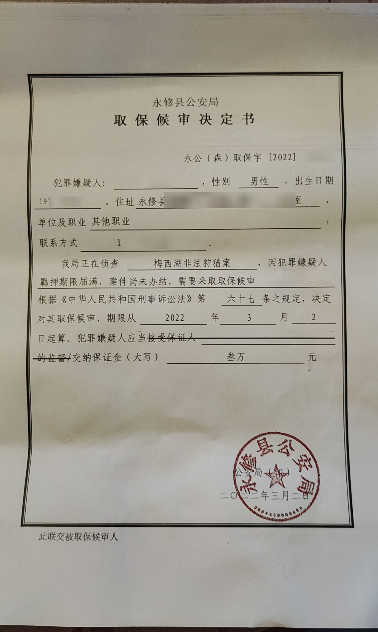 涉案当事人王某某系私营企业主,因陪同两位朋友使用气枪在永修县梅西湖生态保护区射杀两只野鸡(学名:环颈雉,原名:雉鸡,Phasianus colchicus)和一只野鸭(学名:斑嘴鸭,Anas zonorhyncha)。事后被相关知情人员举报案发,王某某及另两名当事人均被公安机关采取刑事拘留强制措施。